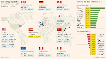 Las Bolsas mundiales se despiden de febrero con una mezcla de euforia contenida y prudencia creciente. En una sesión marcada por las dudas en Wall Street y la incertidumbre que genera la inteligencia artificial (IA) los principales índices de todo el mundo se han teñido rojo. Y aunque el balance semanal y mensual es positivo, entre los mercados persiste la sensación de que, bajo la superficie de los índices, las corrientes son más turbulentas de lo que sugiere la racha alcista.